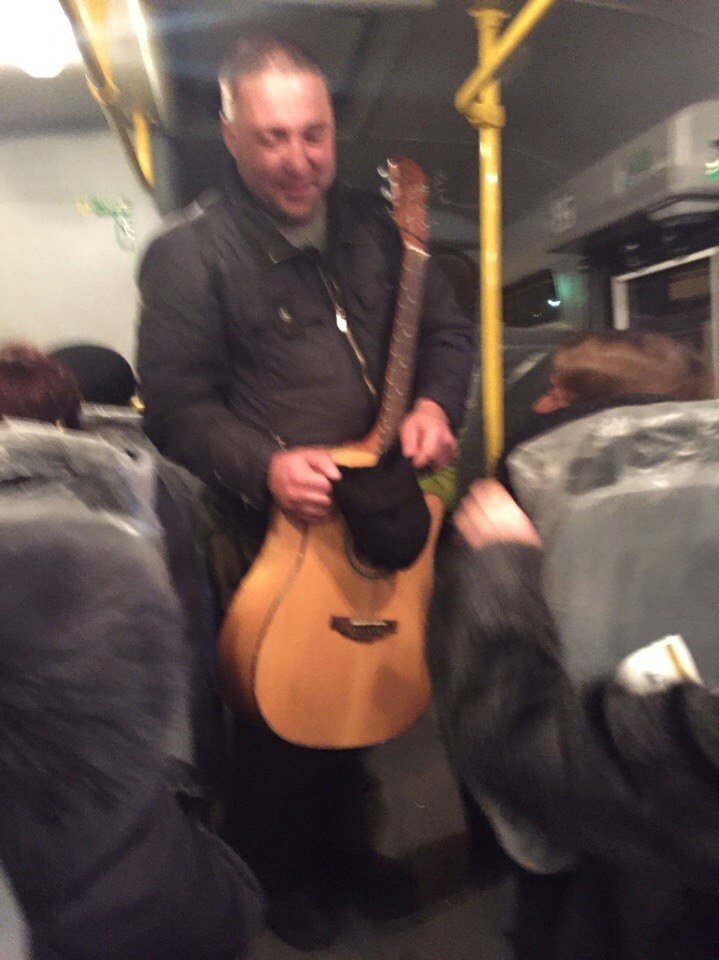 В редакцию портала «Пенза-Взгляд» поступило видео от жительницы Пензы, ставшей зрительницей и слушательницей неожиданного вечернего концерта: в салон автобуса, следовавшего в Арбеково, вошел музыкант, который стал исполнять популярные песни под гитару.