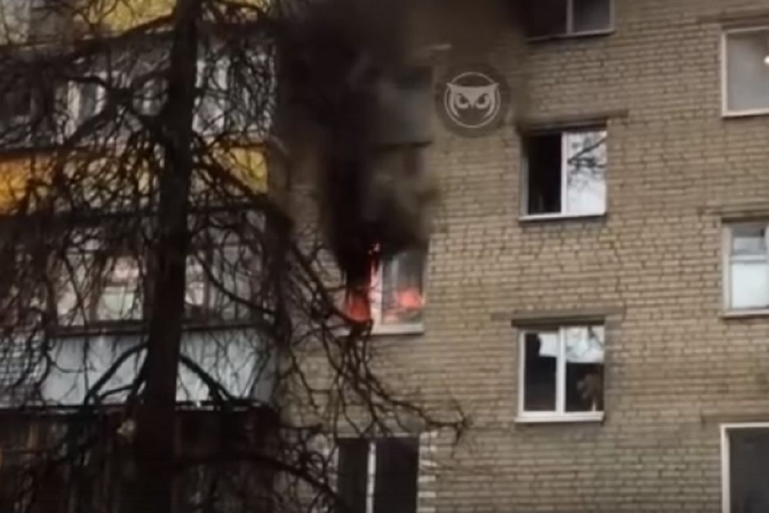 На снятых кадрах видно, как из окна пробивается огонь и валит черный дым, за стеклом видны языки пламени.