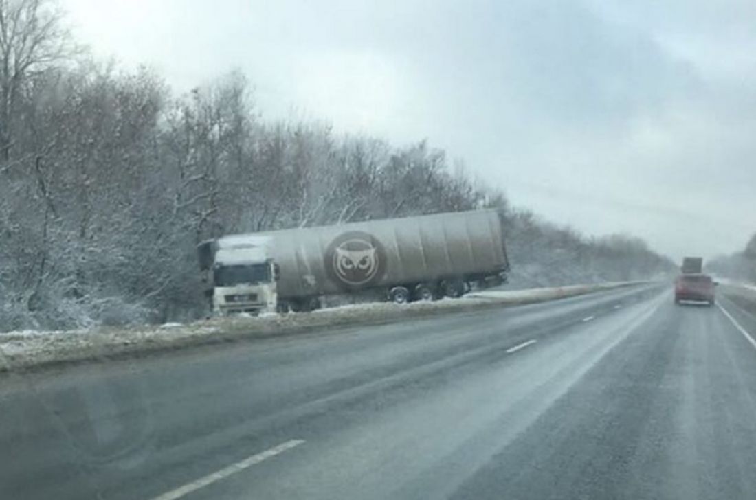 Инцидент случился около часа дня. Судя по фотографии, фура улетела с проезжей части в кювет. Серьезных повреждений на кадре не видно, подробности случившегося уточняются в официальных источниках.