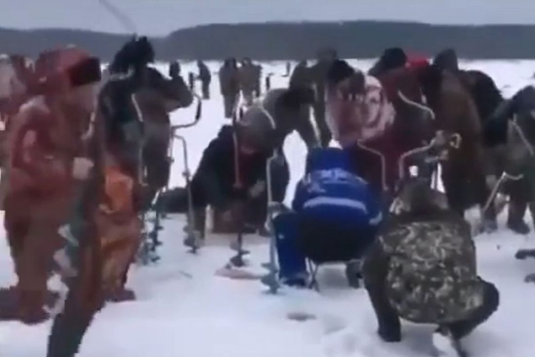 «Клюет только здесь». Больше десятка рыбаков бурили под собой лед на маленьком «пятачке». Видео