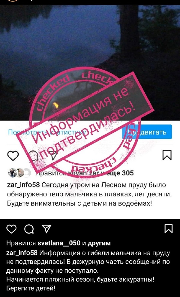 «Сегодня утром на Лесном пруду было обнаружено тело мальчика в плавках, лет десяти. Будьте внимательные с детьми на водоемах!» - появился пост в инстаграм-аккаунте zar_info58.
