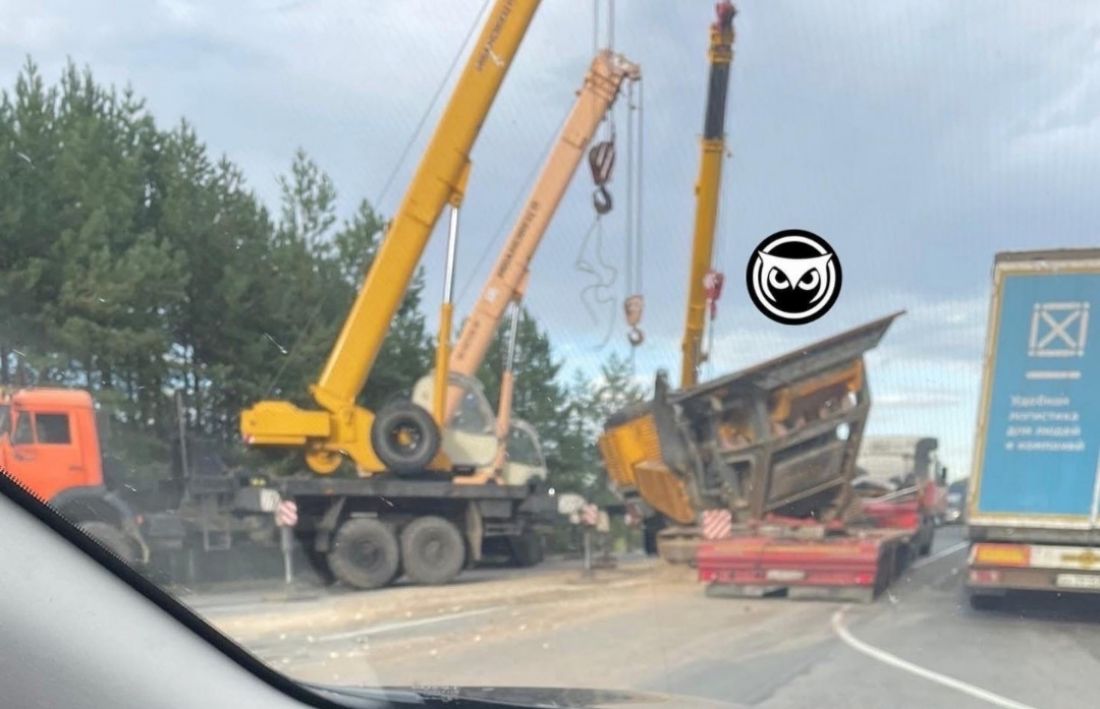 На участке федеральной трассы М-5 с платформы низкорамного трала упал трактор. В результате произошедшего он оказался прямо на проезжей части и помешал движению попутных транспортных средств.