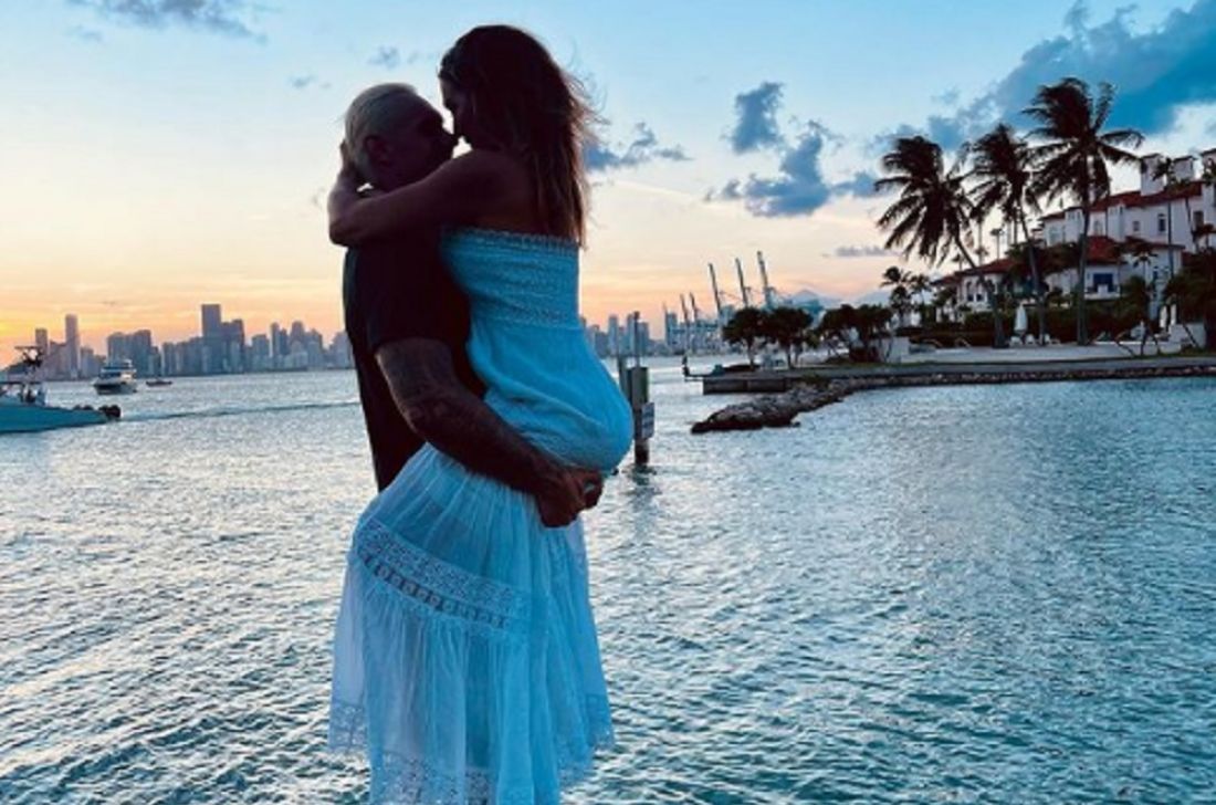 На ней знаменитость в длинном белом платье обнимается со своим возлюбленным, футболистом Янисом Тимма. Фотография сделана на закате на фоне морского города.