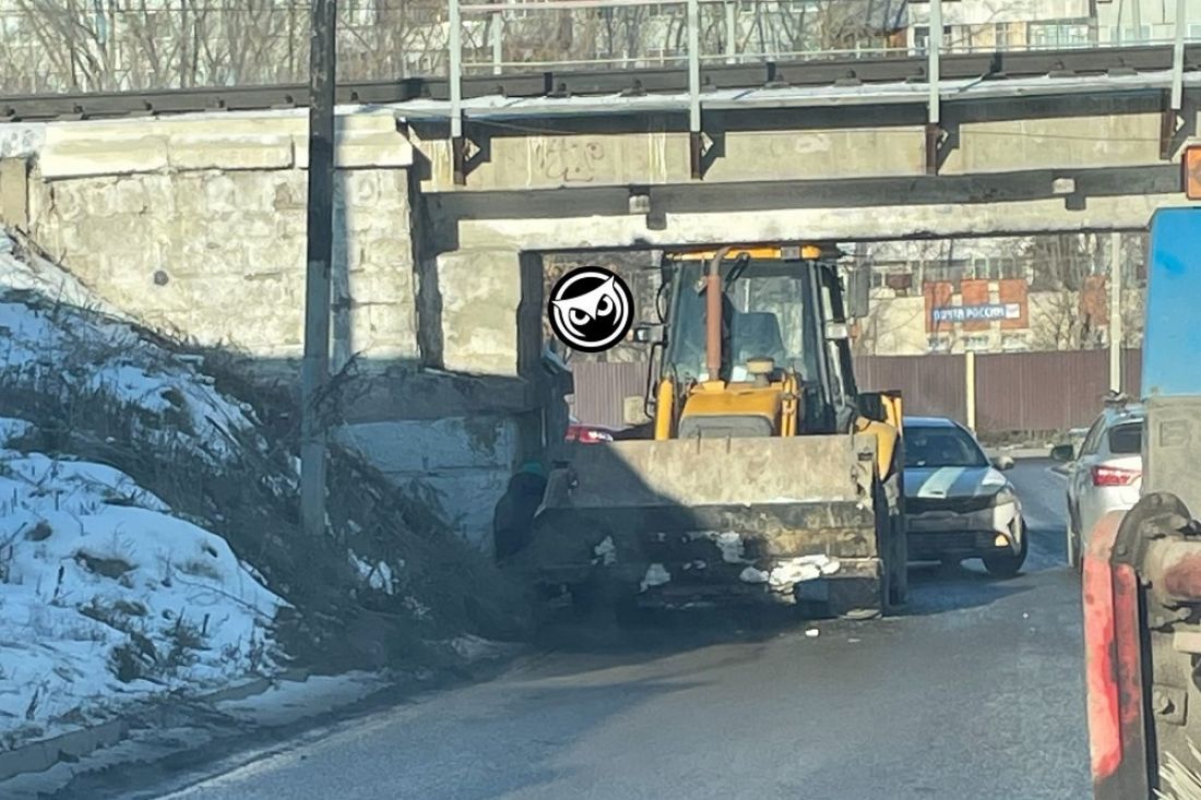 Транспортное средство застряло под железнодорожными путями при въезде на Бугровку по улице Ладожская. Водитель трактора не оценил габариты, в результате чего крыша техники оказалась зажата.