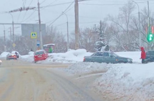 Автомобилисты, ехавшие по улице Чаадаева, увидели машину, которая угодила в снежный занос. Инцидент случился рядом с остановкой, прямо перед пешеходным переходом.