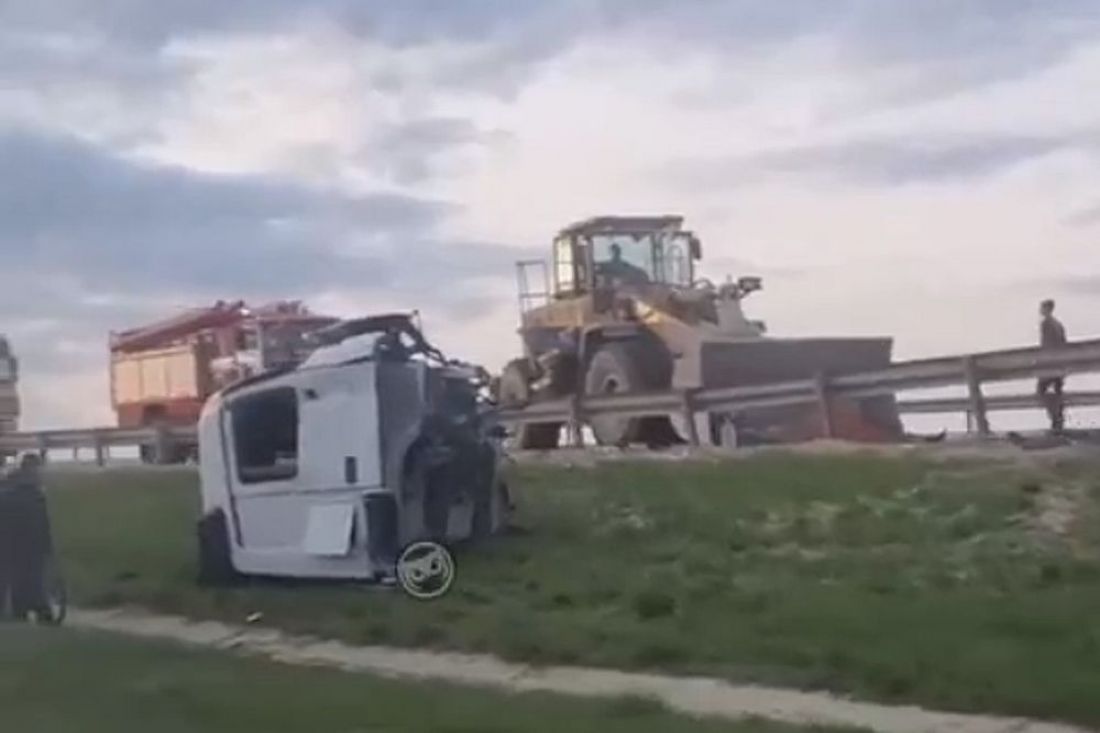 На снятых очевидцами последствий ДТП кадрах заметна лежащая отдельно кабина одного из большегрузов и сидящий около нее мужчина.