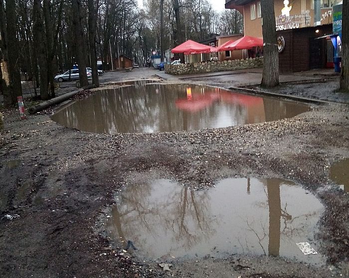 В комментариях к посту иронично заметили, что поскольку эта же дорога ведет к центральному КПП Военного городка, лужи являются естественными «лежачими полицейскими» и исправно выполняют свою «функцию».