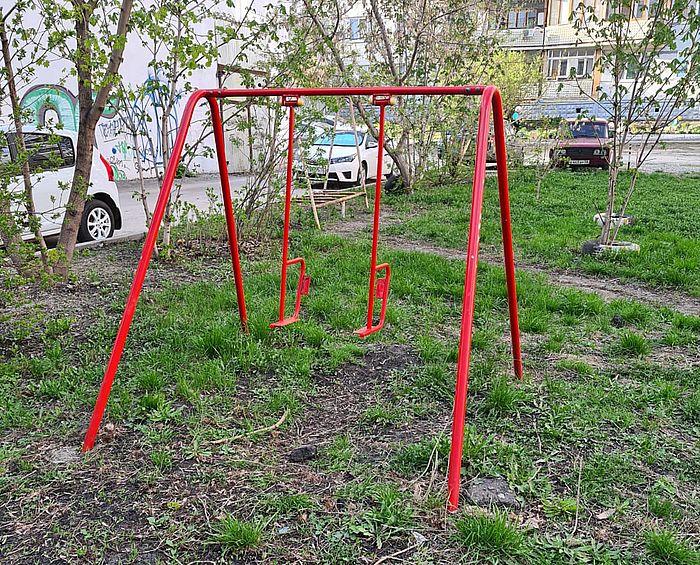 Качели без сидений дополняют разрушенные песочницы.