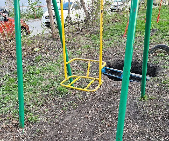 Апогей «благоустройства» - глубокая яма с выброшенной в нее конструкцией позади детских качелей без сидения.