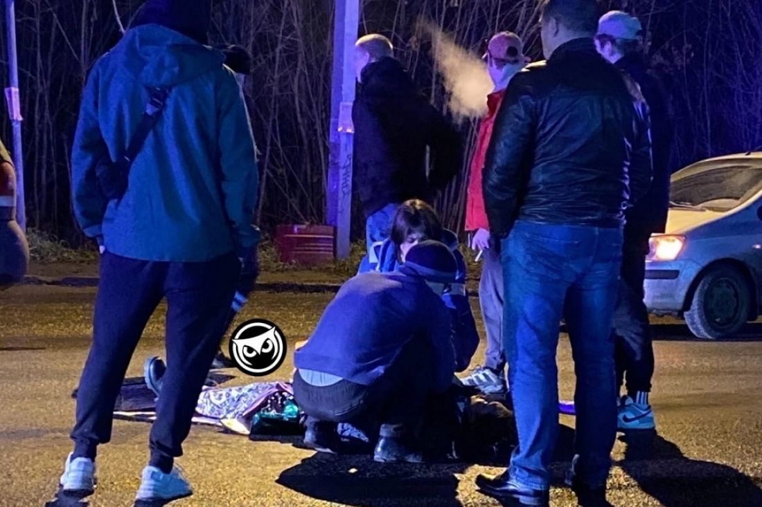 На снимке, размещенном в сообществе, запечатлен лежащий на асфальте человек, вокруг которого собрались люди. На втором фото - пятно крови на месте происшествия. Обстоятельства случившегося устанавливаются.
