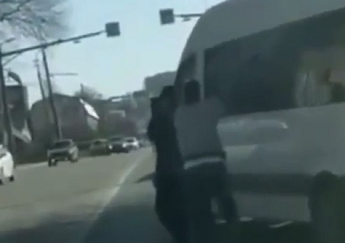 Один из мужчин подходит к маршрутке, открывает водительскую дверь, намереваясь силой вытащить оттуда противника, однако, судя по всему, тот и сам не собирался отсиживаться в кабине.