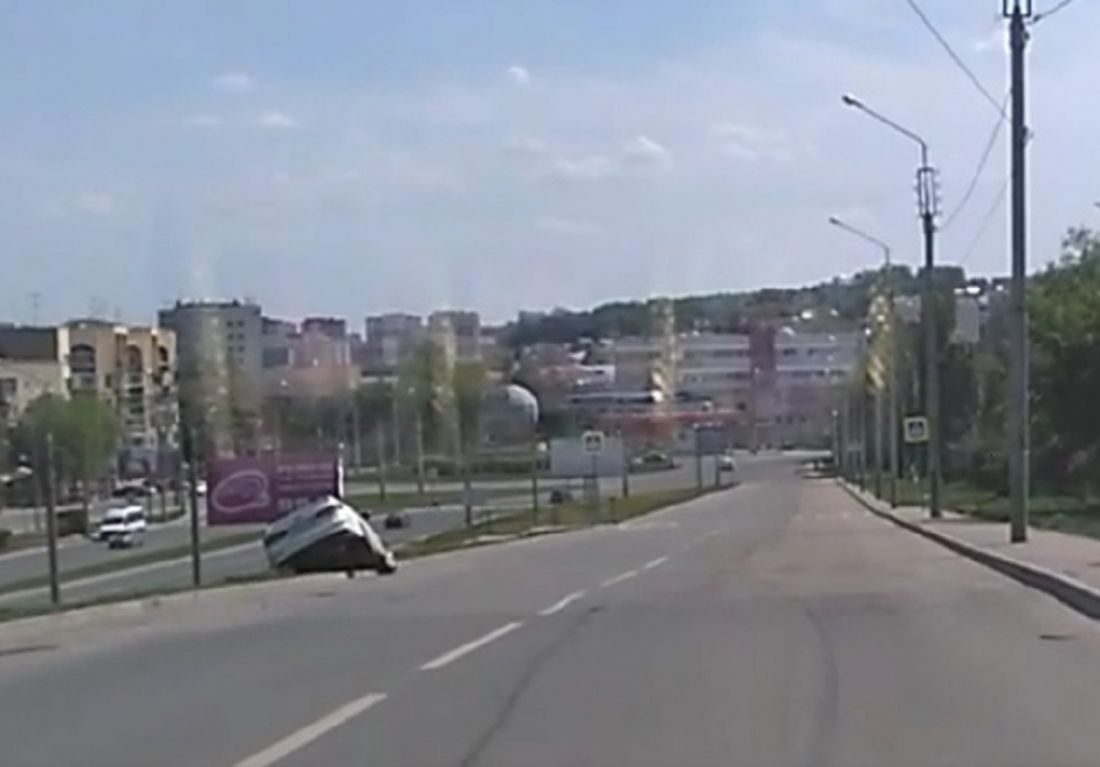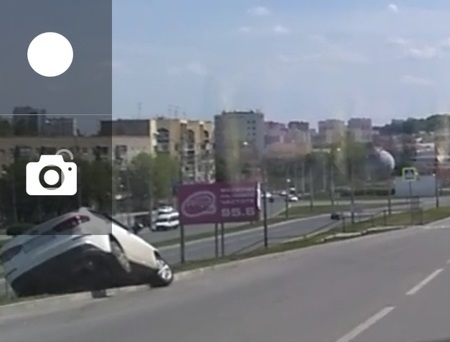 На снятых кадрах запечатлен легковой автомобиль, по какой-то причине вылетевший с проезжей части на обочину. Правое переднее колесо его осталось на дороге, а заднее с той же стороны повисло в воздухе.