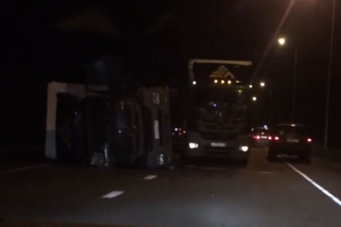 На опубликованном им видео запечатлена лежащая на боку фура, рядом с которой стоит еще один большегруз, однако является ли он участником аварии неясно. Кроме того, на кадрах видно, что в кювете стоит еще одна грузовая машина. Судя по всему, авария произошла в ночное время. Однако автор поста не уточнил точное место ДТП.