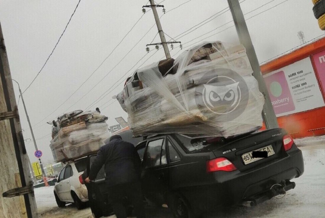 На снимке, размещенном в сообществе, запечатлены два автомобиля, к крыше которых примотан груз. Одно из транспортных средств нагрузили настолько, что автомобиль получил повреждения.
