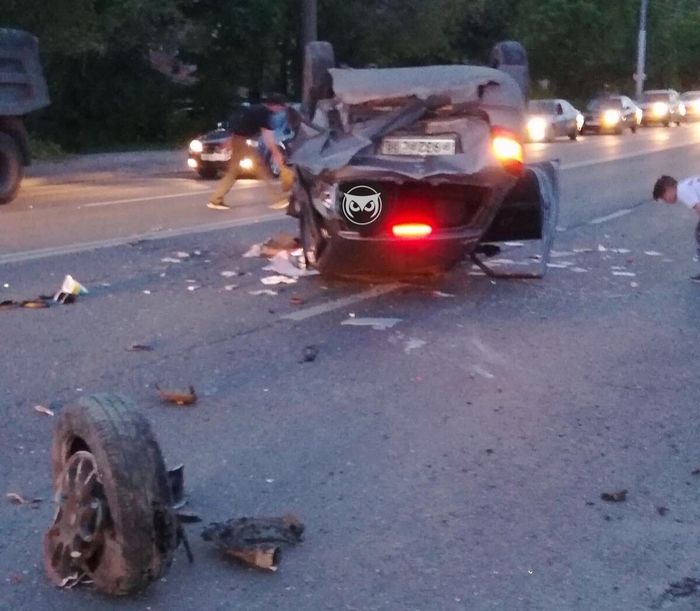 В результате сильного удара чешская иномарка перевернулась на крышу.