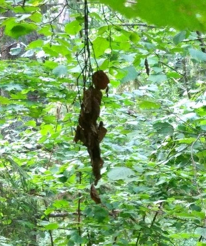«Повешенными» оказались свисающие с обломанной ветки желтеющие листья дерева, однако иллюзия с далекого расстояния оказалась весьма впечатляющей.