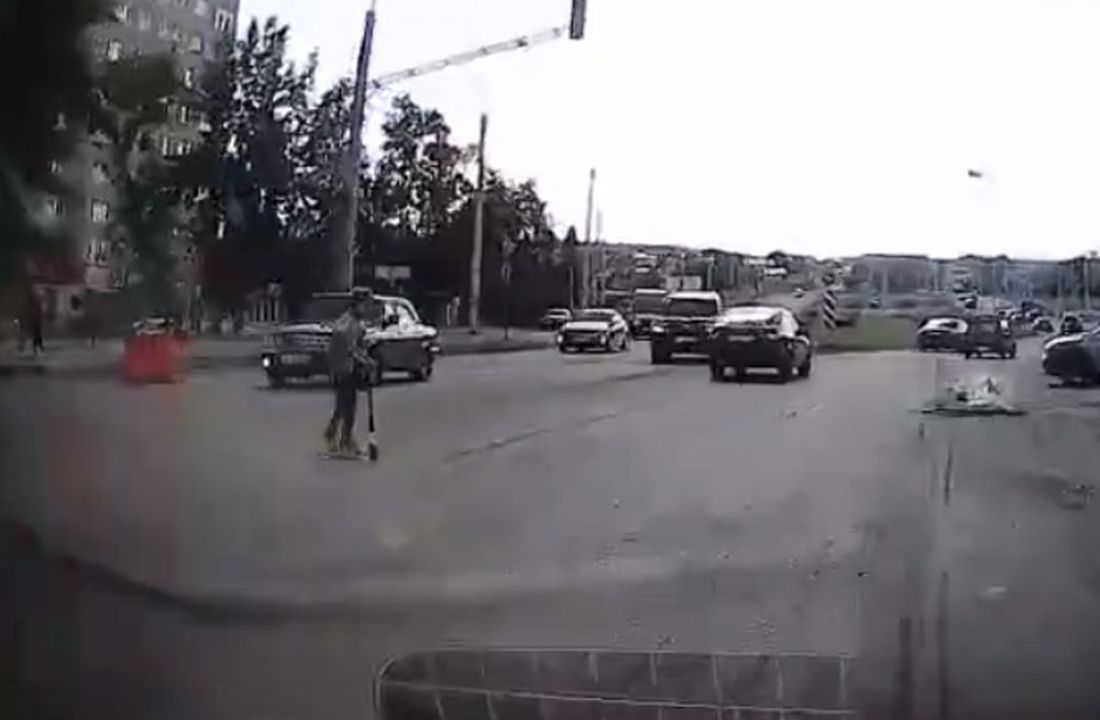 В ролике, который можно смотреть с 45-й секунды, видно, как несовершеннолетний катится на самокате по пешеходному переходу в тот момент, когда для него уже загорелся красный сигнал светофора, и машины начали движение. В последний момент ребенок соскакивает со своего транспорта и, возможно, тем самым спасает себе жизнь и здоровье.