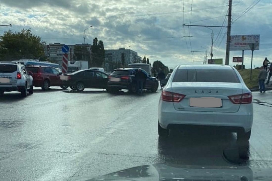 Судя по снимку, участниками ДТП стали иномарки «Audi Q7» и «Ford Focus», модель третьего автомобиля по представленному фото определить невозможно. Столкнувшиеся машины заняли большую часть дороги.