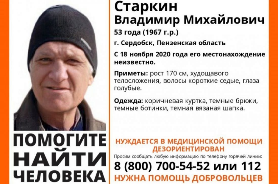 Особо отмечается, что мужчина дезориентирован и нуждается в медицинской помощи. Тех, кто обладает информацией о местонахождении Владимира Старкина, просят позвонить на горячую линию по телефону: 8-800-700-54-52 (звонок бесплатный).