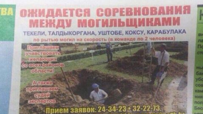 Необычные кладбищенские игры решила организовать газета «Вечерний Талдыкорган». Согласно напечатанному объявлению, соревноваться должны могильщики Текели, Талдыкоргана, Уштобе, Коксу и Карабулака, а главным критерием, по которому будут определять победителя - время, затраченное на рытье стандартной могилы.