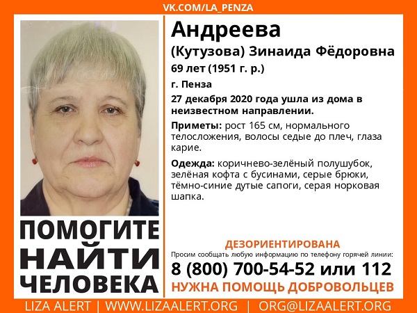 Представители пензенского отделения поискового отряда «Лиза Алерт» сообщили о пропаже 69-летней жительницы областного центра. Накануне, 27 декабря, Зинаида Андреева (Кутузова) ушла из дома в неизвестном направлении.