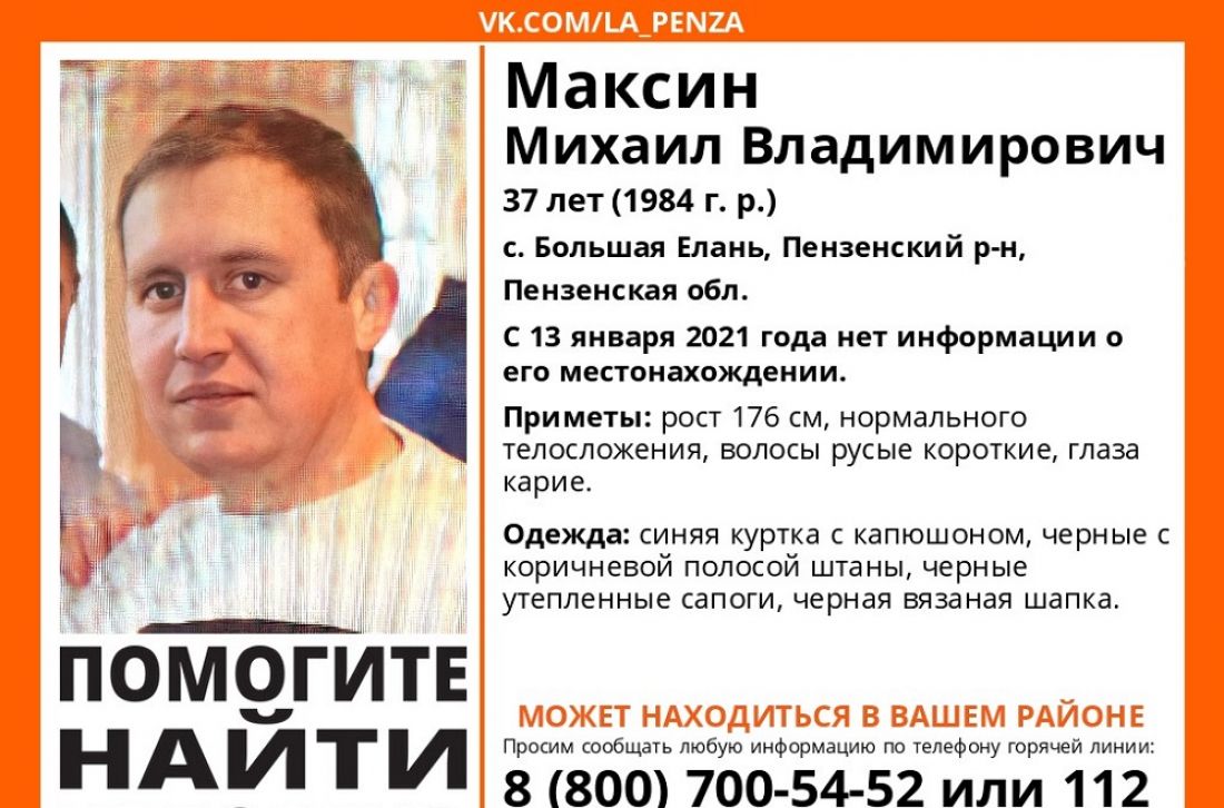 В группе поискового отряда «Лиза Алерт» Пензенской области в «ВКонтакте» размещена ориентировка на пропавшего, в которой сообщается, что его местонахождение неизвестно с 13 января.