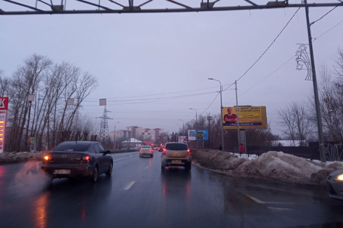 На улице Антонова под снегом оказалась целая полоса проезжей части. Именно на эту полосу должны выезжать автомобилисты со второстепенной дороги, после чего перестраиваться на главную дорогу.
