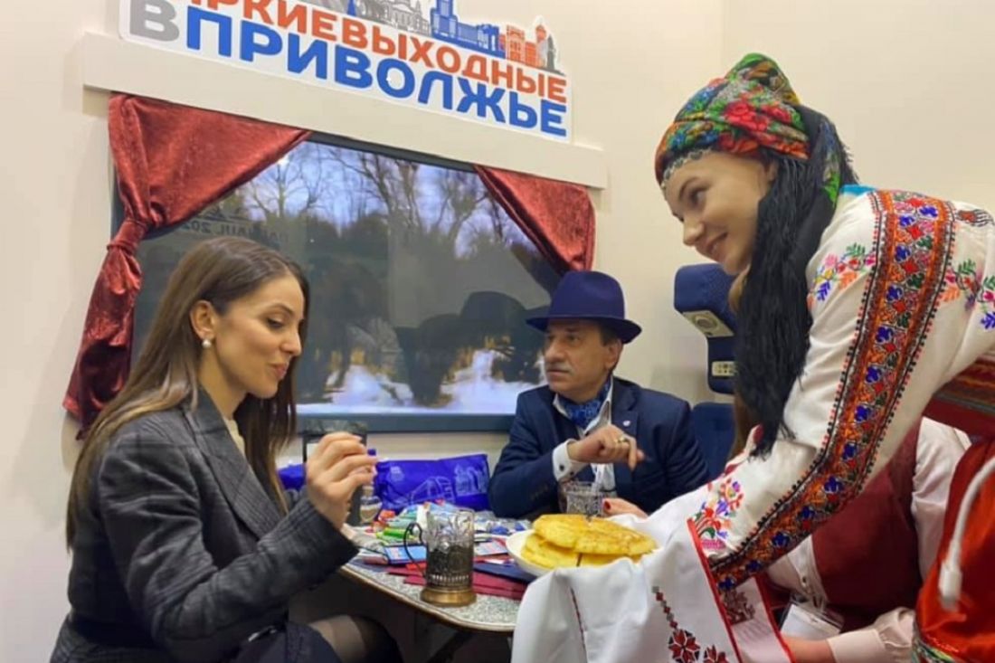 Руководитель Ростуризма Зарина Догузова посетила стенд проекта, выполненный в виде небольшого купе поезда дальнего следования в ходе официального обхода экспозиций Международной туристической выставки «Интурмаркет-2021», и высоко оценила замысел.