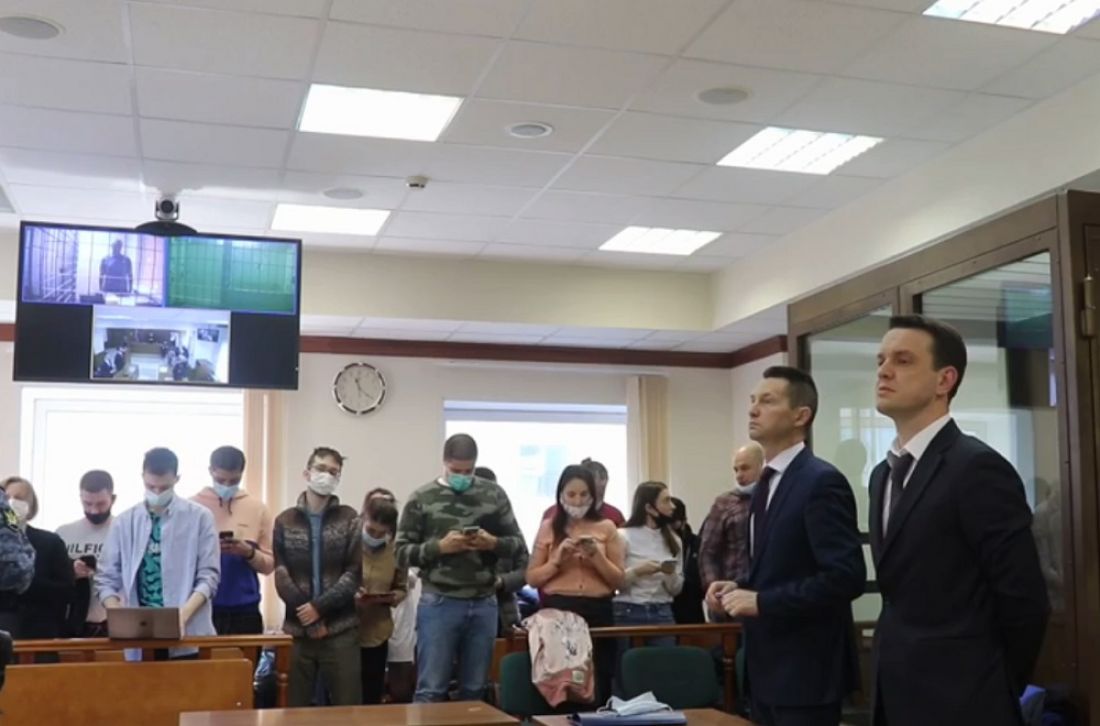 На кадрах, предоставленных пресс-службой суда, кроме присутствующих в зале адвокатов и журналистов, виден экран, где транслируется происходящее в камерах заключенных. В левом верхнем углу – камера Белозерцева. Он, как и положено, слушает решение суда стоя.