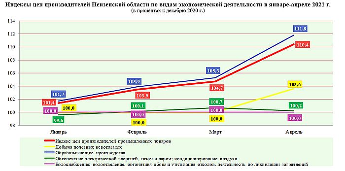 Пензастат подсчитал индекс цен производителей промышленных товаров в Пензенской области, который показывает изменение уровня цен в апреле 2021 года по отношению к декабрю 2020-го.