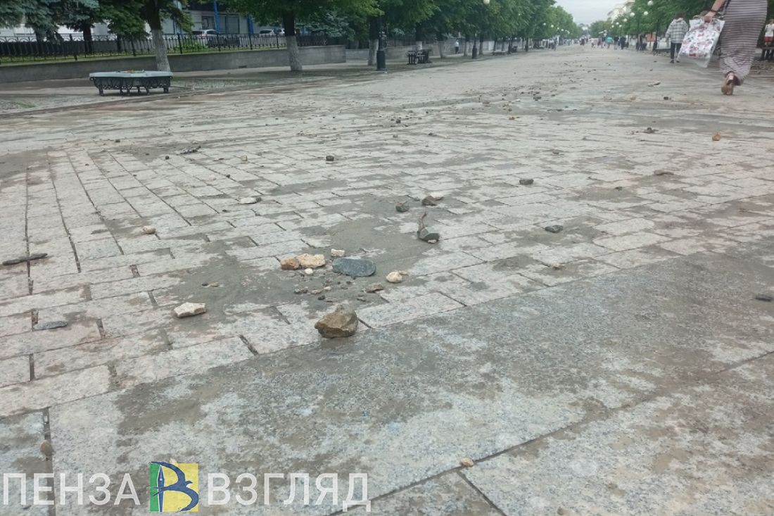 Прошедший ливень превратил городские улицы в реки. На этом сюрпризы не кончились. После дождя участок Московской от ТЦ «Высшая Лига» до улицы Максима Горького оказался покрытым крупными камнями.