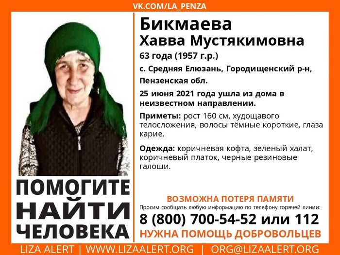 О поисках пропавшей жительницы села Средняя Елюзань Городищенского района сообщили волонтеры отряда «Лиза Алерт Пенза». Здесь не могут найти 63-летнюю Хавву Мустякимовну Бикмаеву.