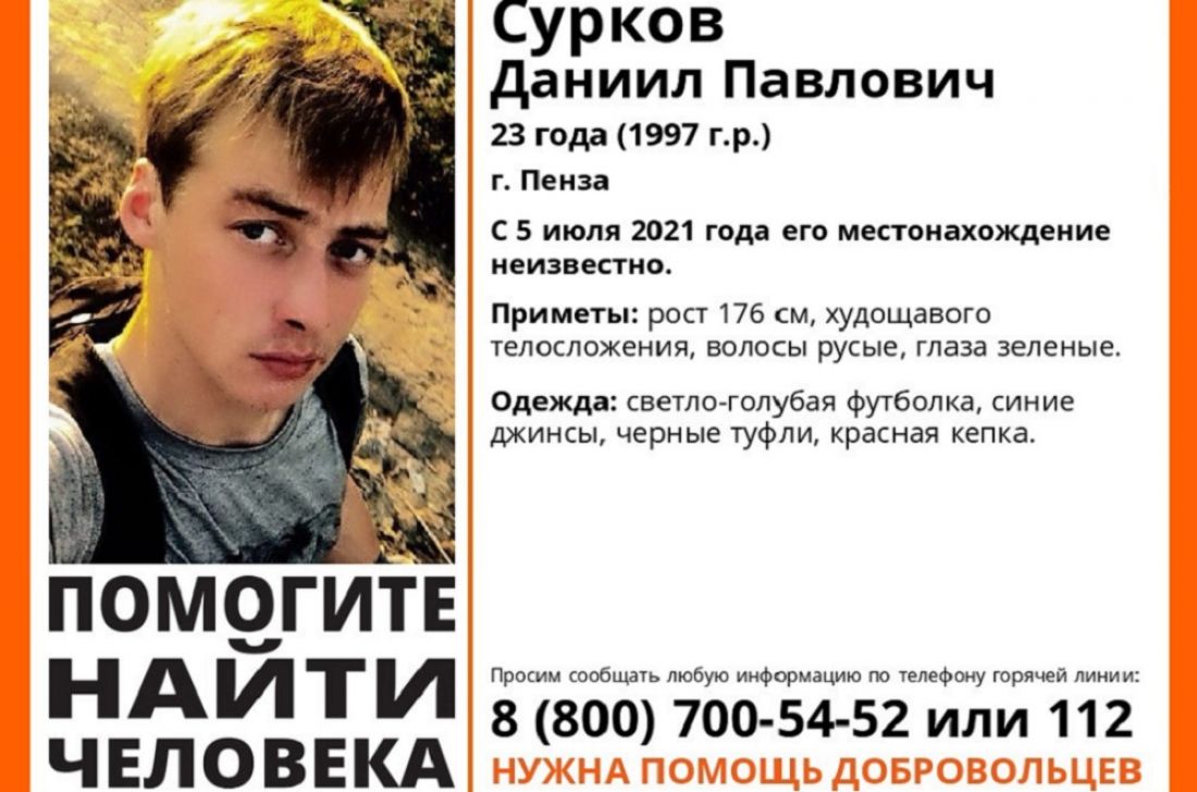 В Пензе пропал Даниил Сурков. О местонахождении 23-летнего молодого человека ничего неизвестно с 5 июля.