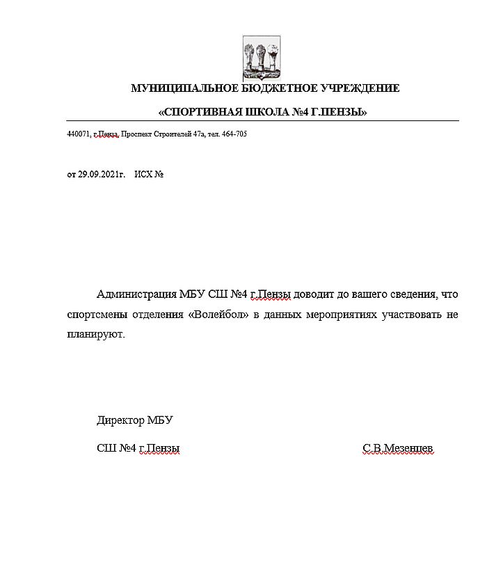 Оперативно пояснение прислали из МБУ СШ №4 г. Пензы, где занимаются волейболом. Ответом на запрос присланное письмо нельзя назвать, так как оно пришло без подписи директора и без исходящего номера. Однако пояснением, полагаем, его считать можно, так как адрес отправителя совпадает с электронной почтой, указанной на официальном сайте. Хотя конкретных ответов на все наши вопросы оно не содержит, опубликовать его считаем необходимым.