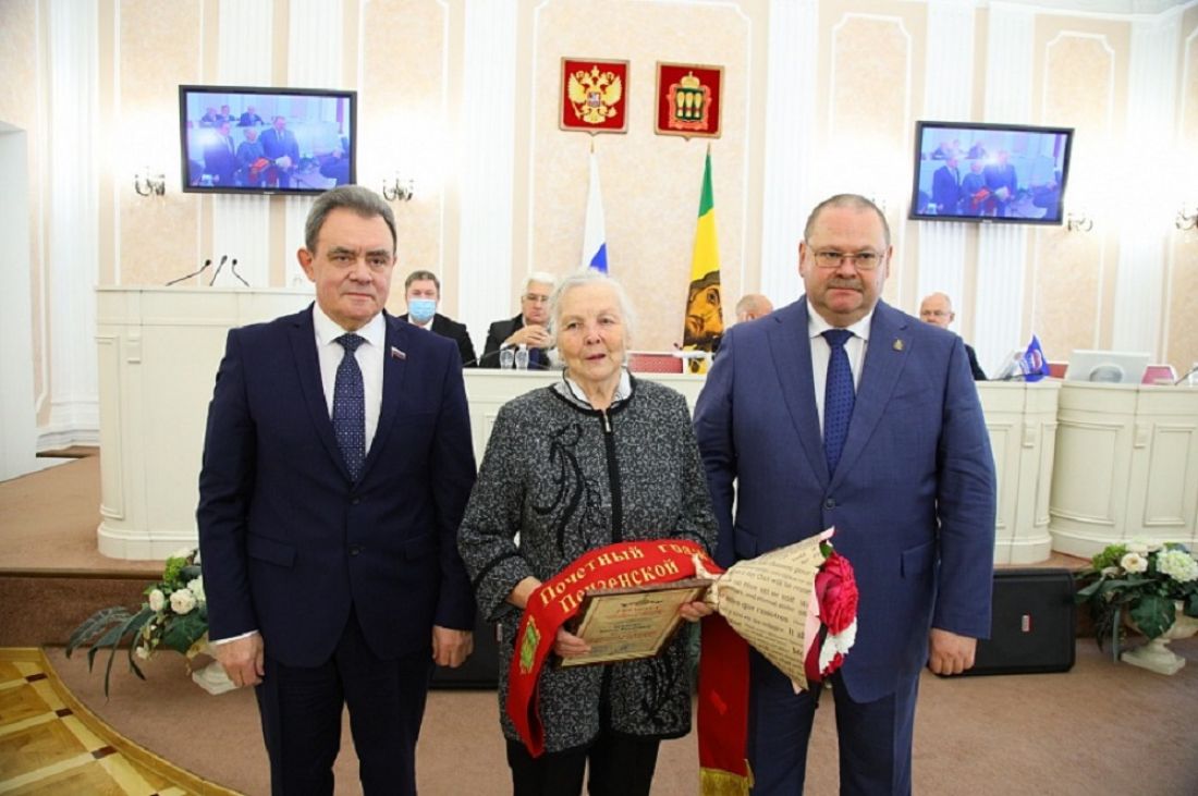 Грамоту Почетного гражданина Пензенской области и почетную ленту получила за мужа вдова экс-главы региона времен СССР, Алевтина Зубкова.