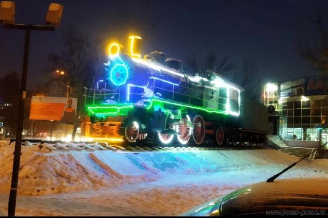 Речь идет о монументе «Паровоз Су213-89», который расположен неподалеку от пензенского автовокзала. Для создания праздничной атмосферы на время новогодних праздников он превратился в сказочного персонажа, героя мультфильмов.