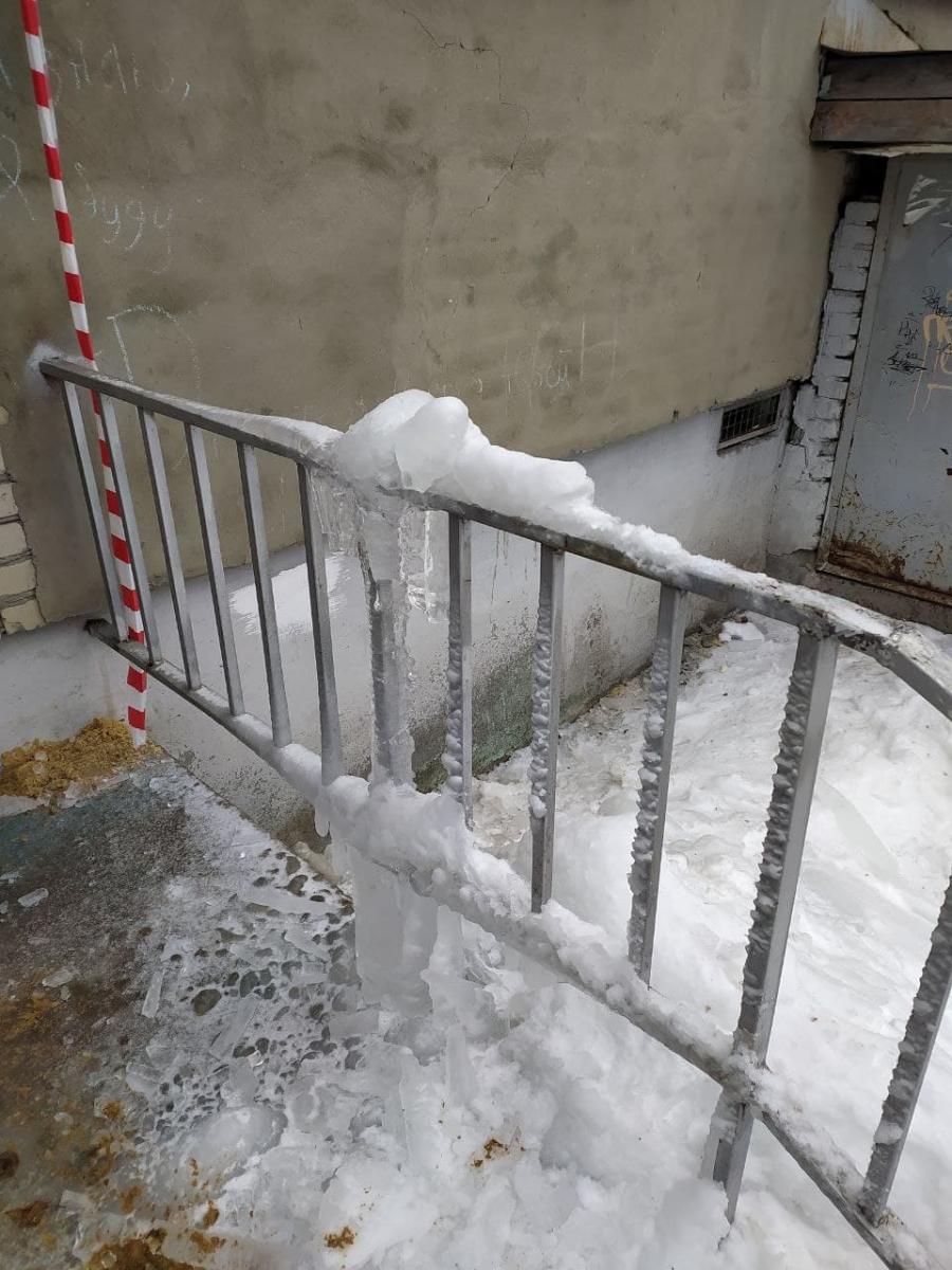 В настоящее время протечка достигла первого этажа. Со стороны фасада на месте протечек образовалась наледь, по которой можно судить о масштабах бедствия.