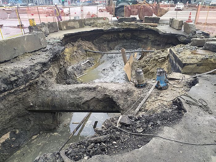 Первой стала зона ремонта коллектора, расположенного недалеко от пересечения проспекта Строителей с улицей Лозицкой. Здесь из-за изношенности подземных коммуникаций регулярно случались провалы дорожного полотна.