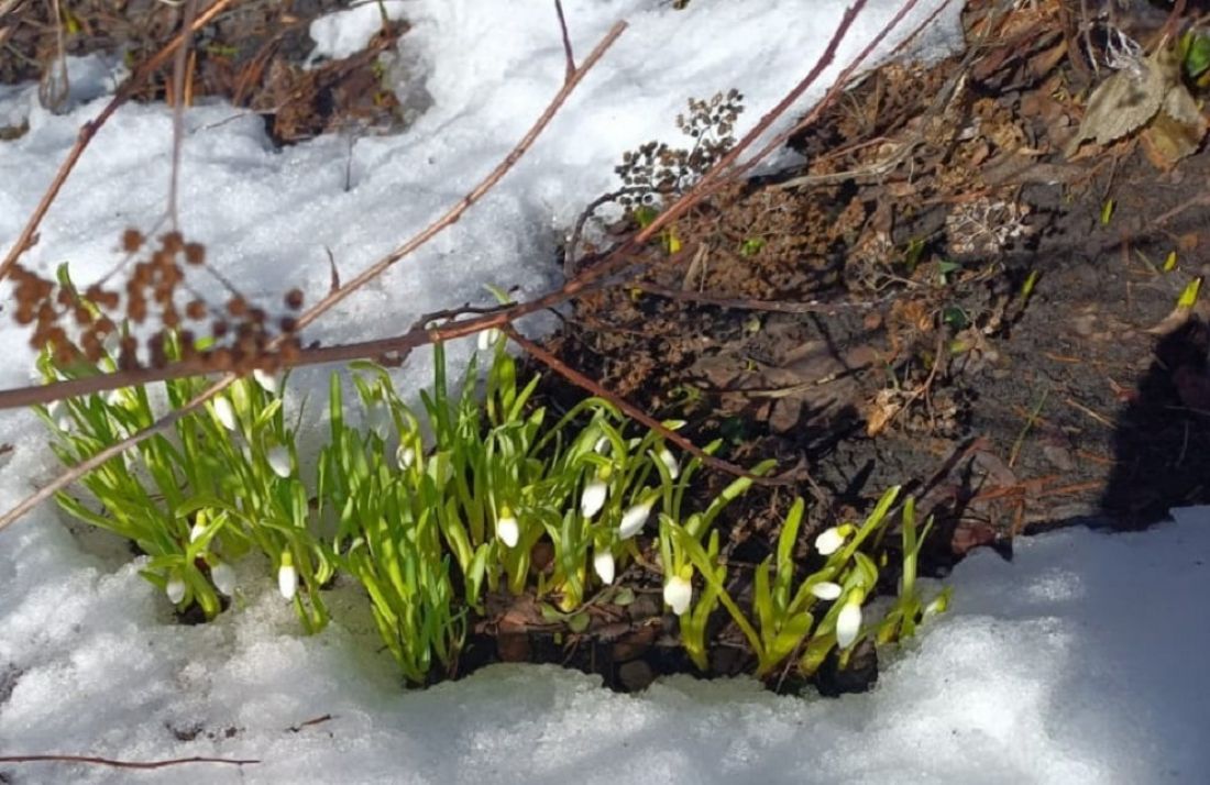 На фотографии, сделанной 5 апреля и размещенной на странице Ботанического сада в социальной сети «ВКонтакте», запечатлен галантус - растение, которое больше известно под названием «подснежник белоснежный». Цветы, оправдывая свое название, появились, когда снег еще не растаял.