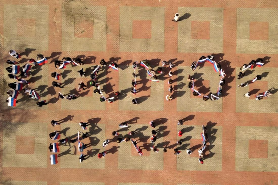 В областном центре молодые активисты выстроились перед Домом молодежи, сформировав слоган «Космос наш».