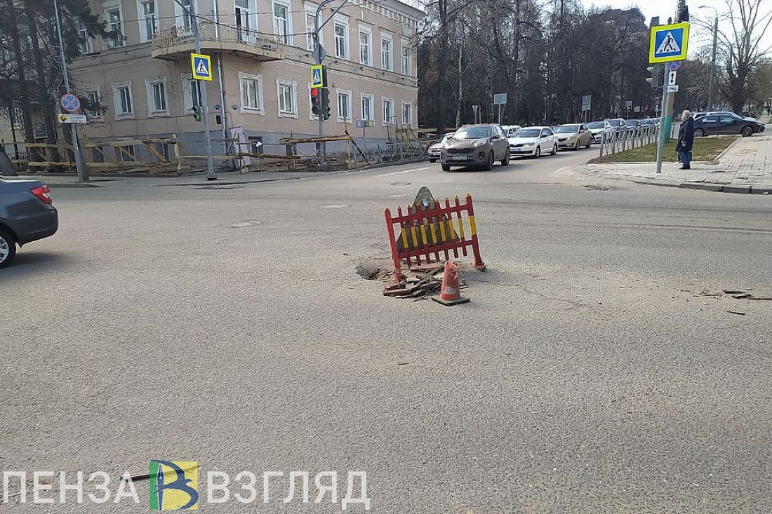 Ограждения, сигнализирующие о проблемах с дорожным покрытием, появились на пересечении улиц Володарского и Карла Маркса в Пензе.