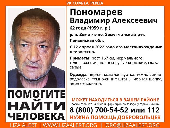 Поисковый отряд «Лиза Алерт Пенза» опубликовал в социальной сети «ВКонтакте» ориентировку на пропавшего жителя рабочего поселка Земетчино - 62-летнего Владимира Пономарева.
