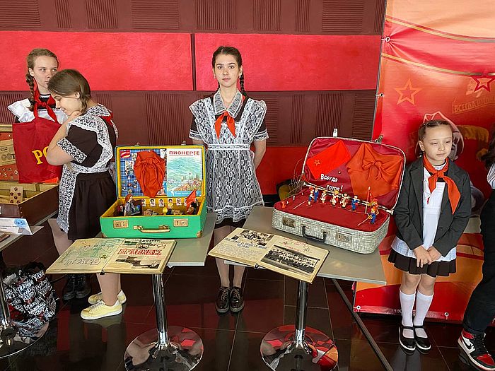 Юные потомки пионеров с удовольствием рассказывали посетителям мероприятия о представленных на выставке экспонатах. Настроения пришедшим добавлял тщательно подобранный репертуар музыкальных произведений.