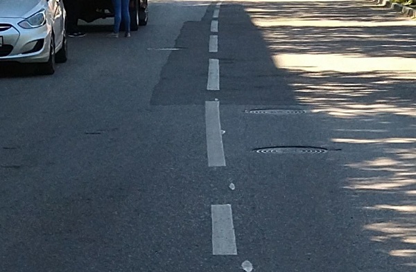 Первое, что бросается в глаза - то, что линии нанесены не очень ровно по отношению друг к другу, а «пляшут». Во-вторых, линии разметки на одном из участков неожиданно прерываются и снова появляются только через полтора-два метра, хотя смысла в таком разрыве нет, поскольку поворот направо находится дальше, чем место, где отсутствует разметка.