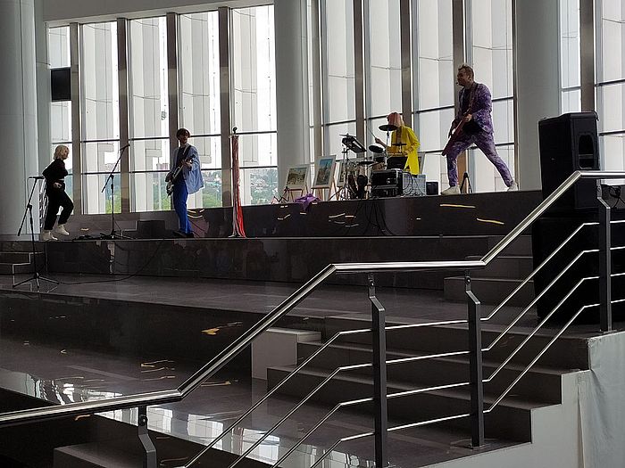В фойе ККЗ царило приподнятое настроение, которое создавалось в том числе с помощью музыкального коллектива, исполнявшего известные молодежные хиты.