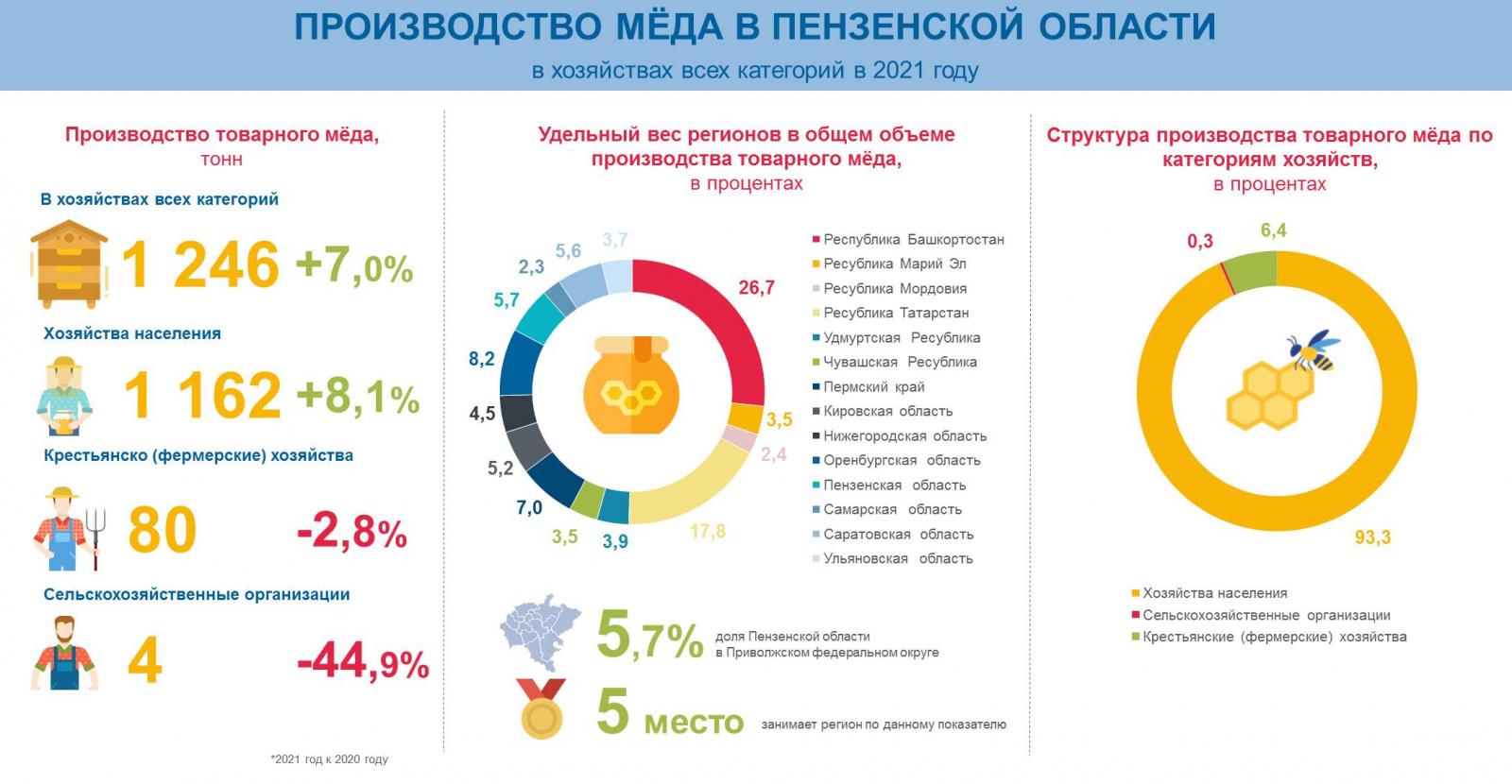 Отмечается, что в 2021 году Пензенская область занимала пятое место в России по удельному весу в общем объема производства товарного меда.