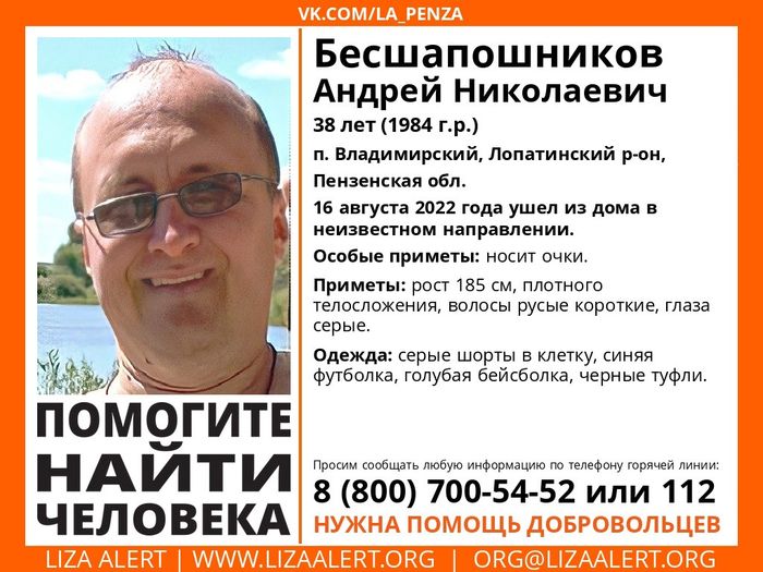 Отряд «Лиза Алерт Пенза» сообщает о начале поисков 38-летнего жителя поселка Владимирский Лопатинского района Андрея Бесшапошникова.