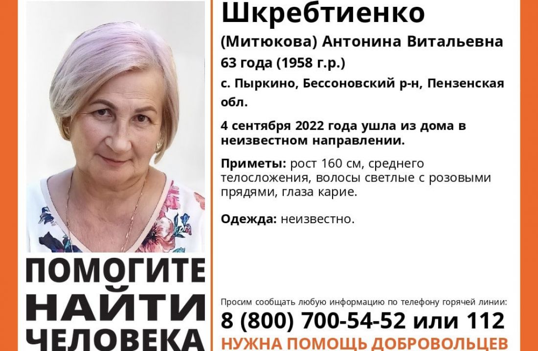Как стало известно, жительница села Пыркино Бессоновского района Антонина Шкребтиенко ушла из дома в неизвестном направлении сегодня, 4 сентября.