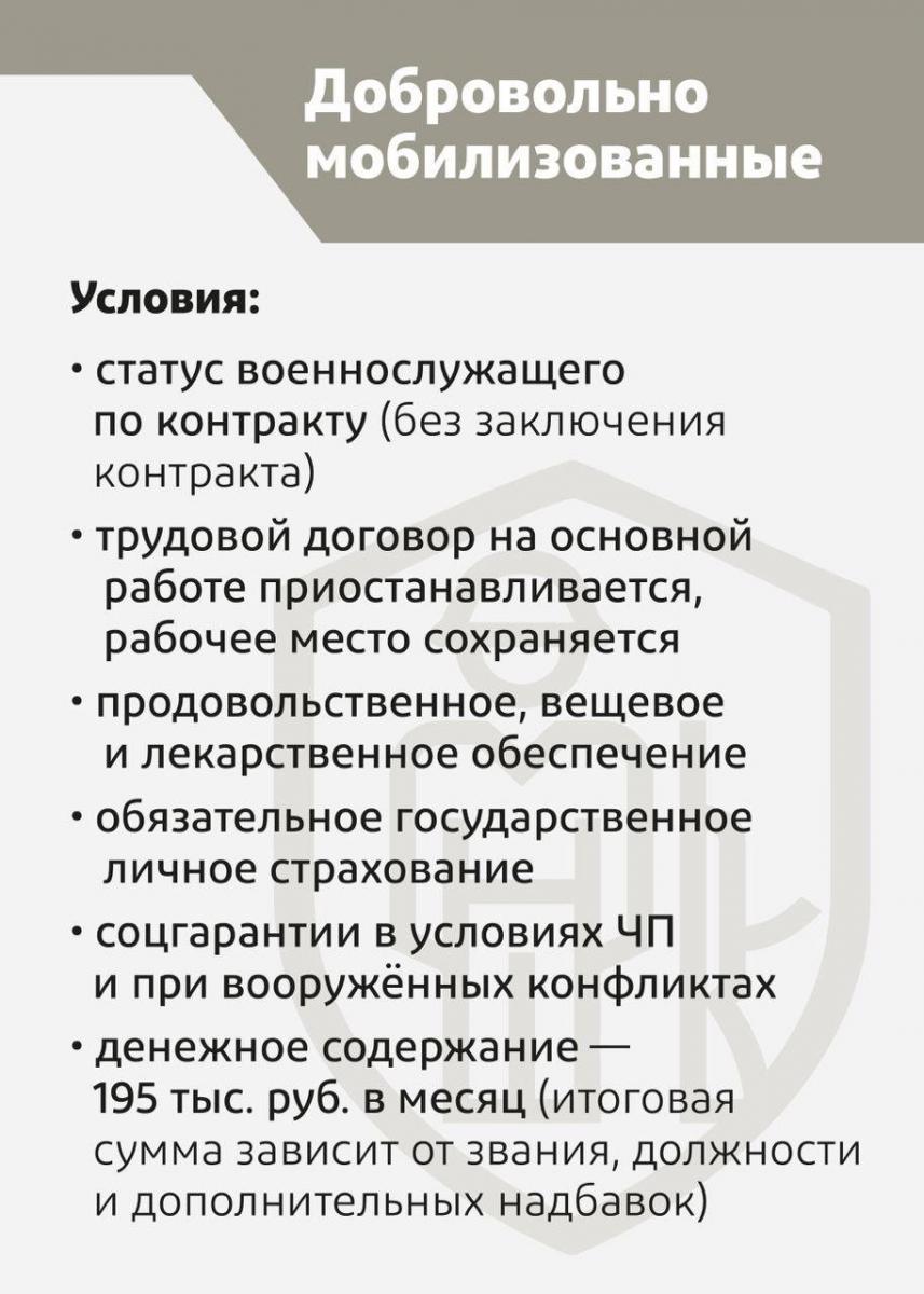 Отмечается, что для них предусмотрены те же самые условия, что и для призванных граждан в ходе частичной мобилизации: