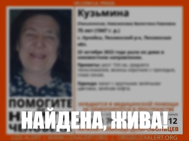 Поздней ночью была обнаружена Валентина Кузьмина (Паньженская, Новоженова). 75-летняя жительница села Урлейка Пензенского района ушла из дома в неизвестном направлении в воскресенье, 23 октября. Волонтеры «ЛизаАлерт» сообщили в социальной сети «ВКонтакте» о том, что женщина нашлась живой на следующий день.
